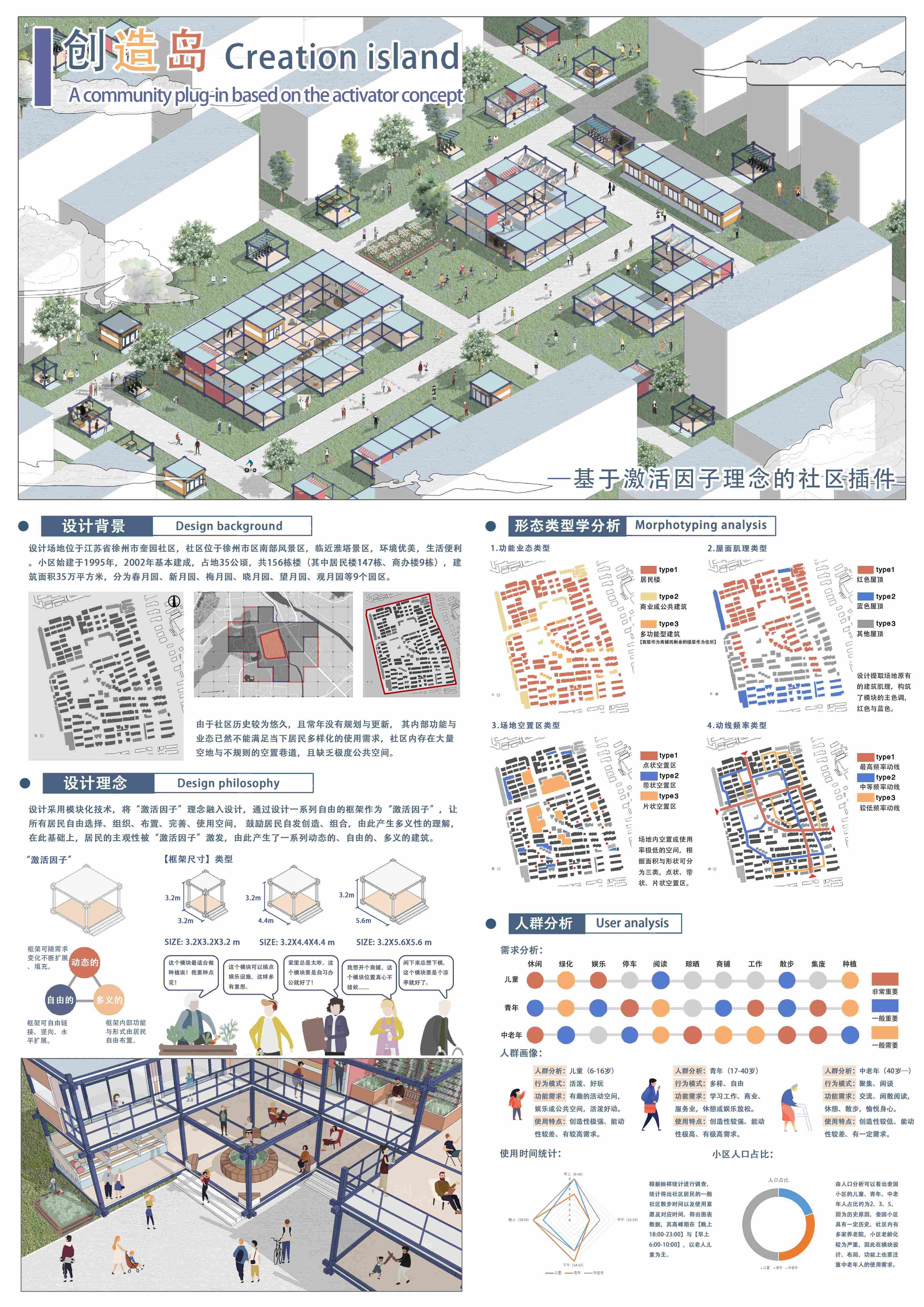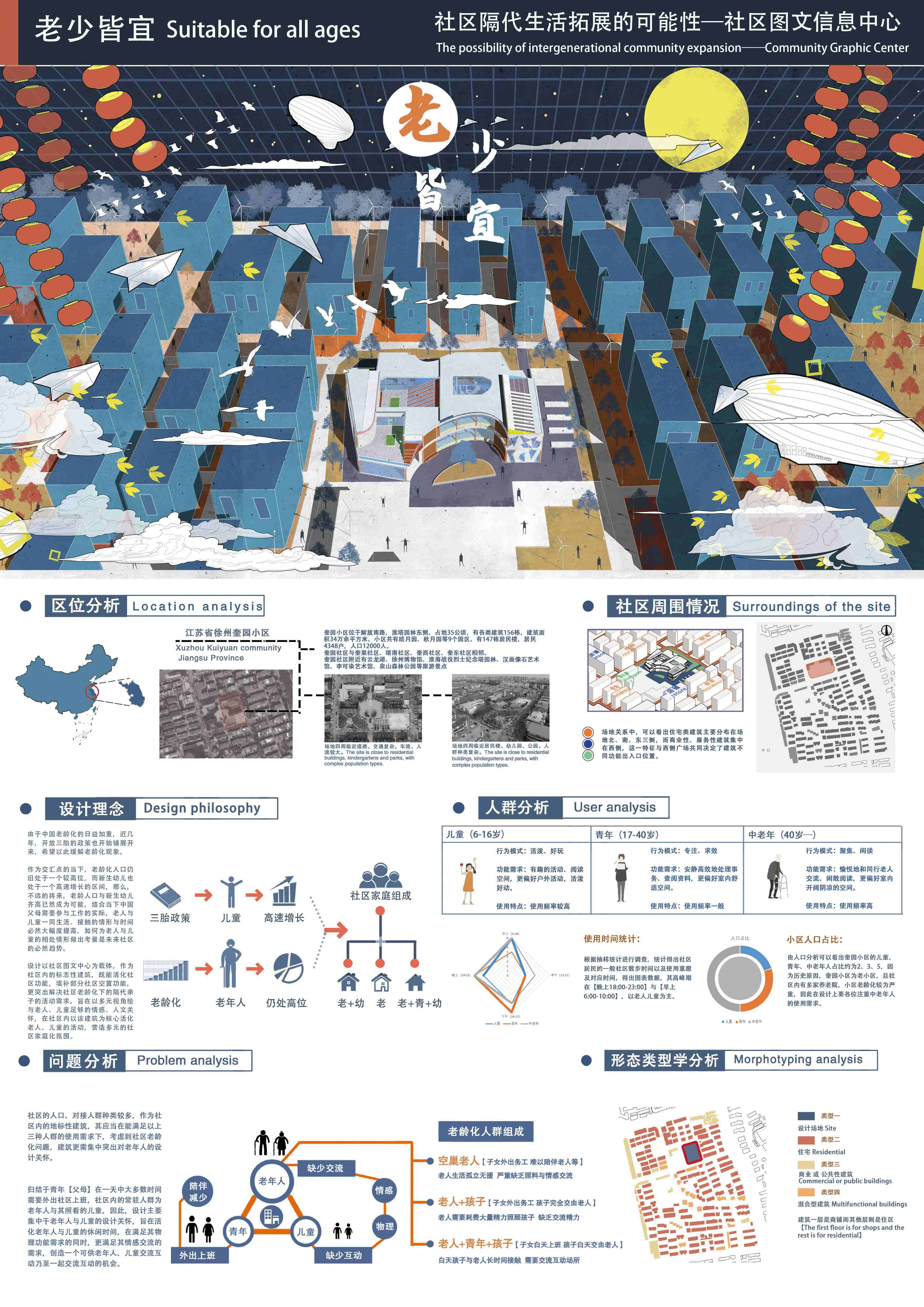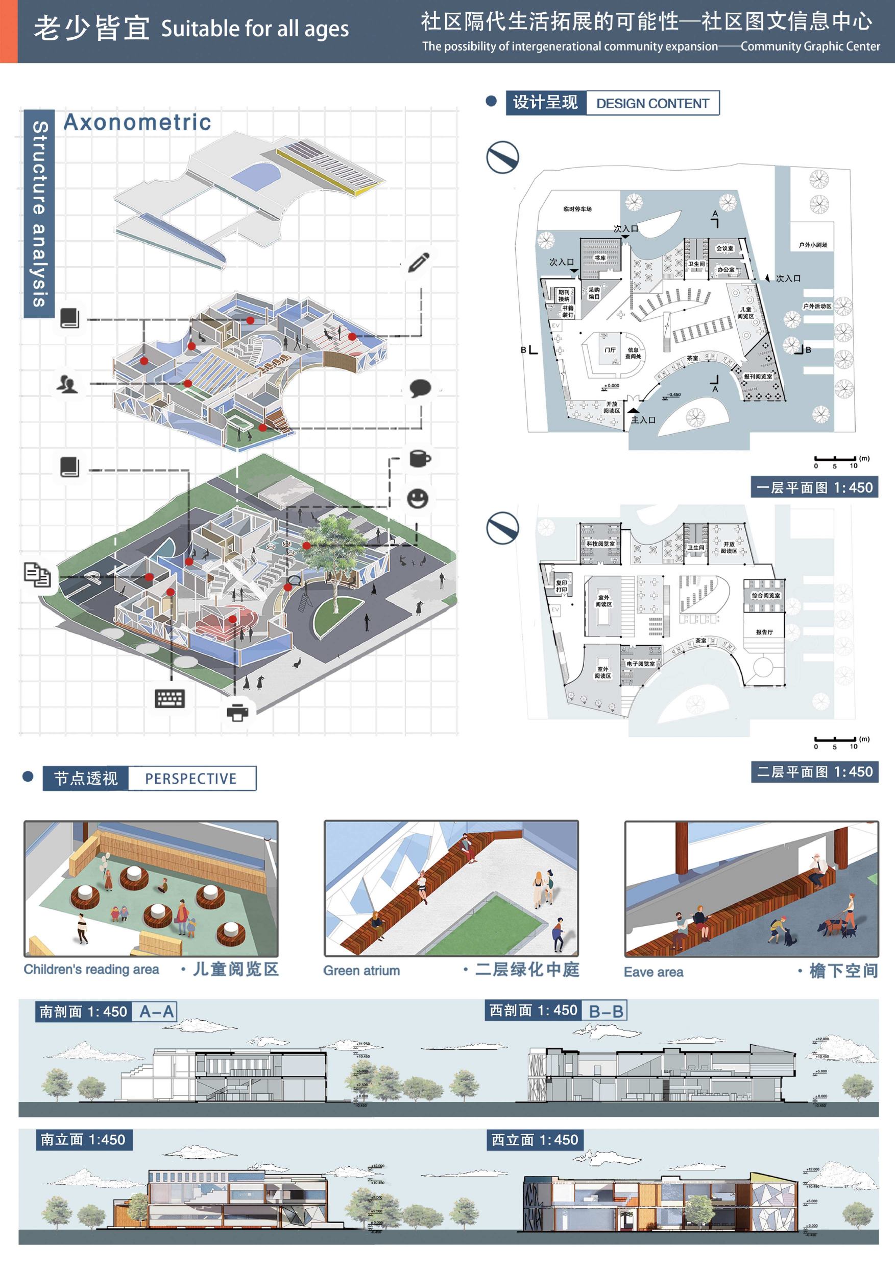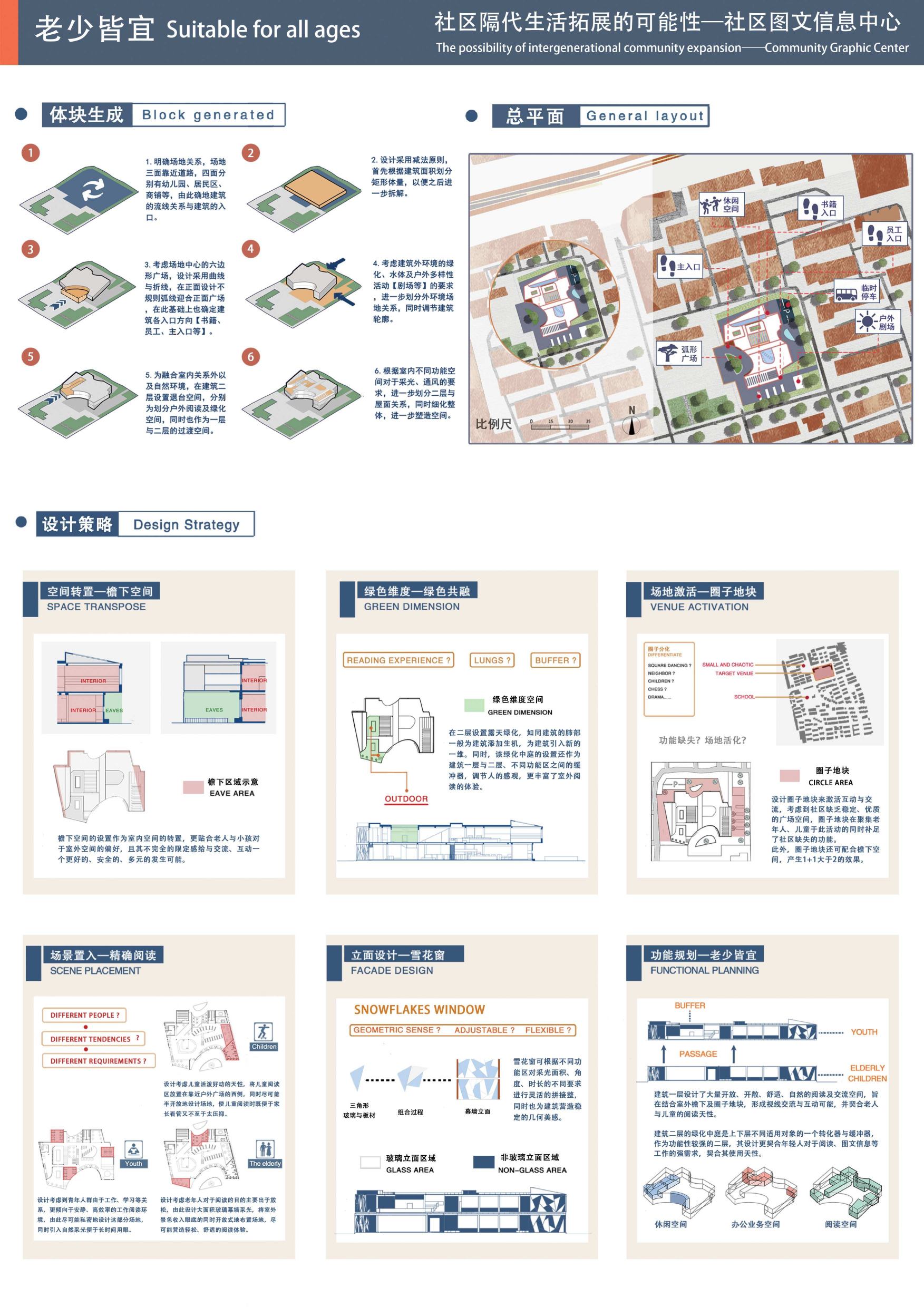 设计以社区图文中心为载体,作为社区内的标志性建筑,既能活化社区功能,填补部分社区空置功能,更突出解决社区老龄化下的隔代亲子的活动需求,旨在以多元视角给与老人、儿童足够的情感、人文关怀,在社区内以该建筑为核心活化老人、儿童的活动,营造多元的社区家庭化氛围。