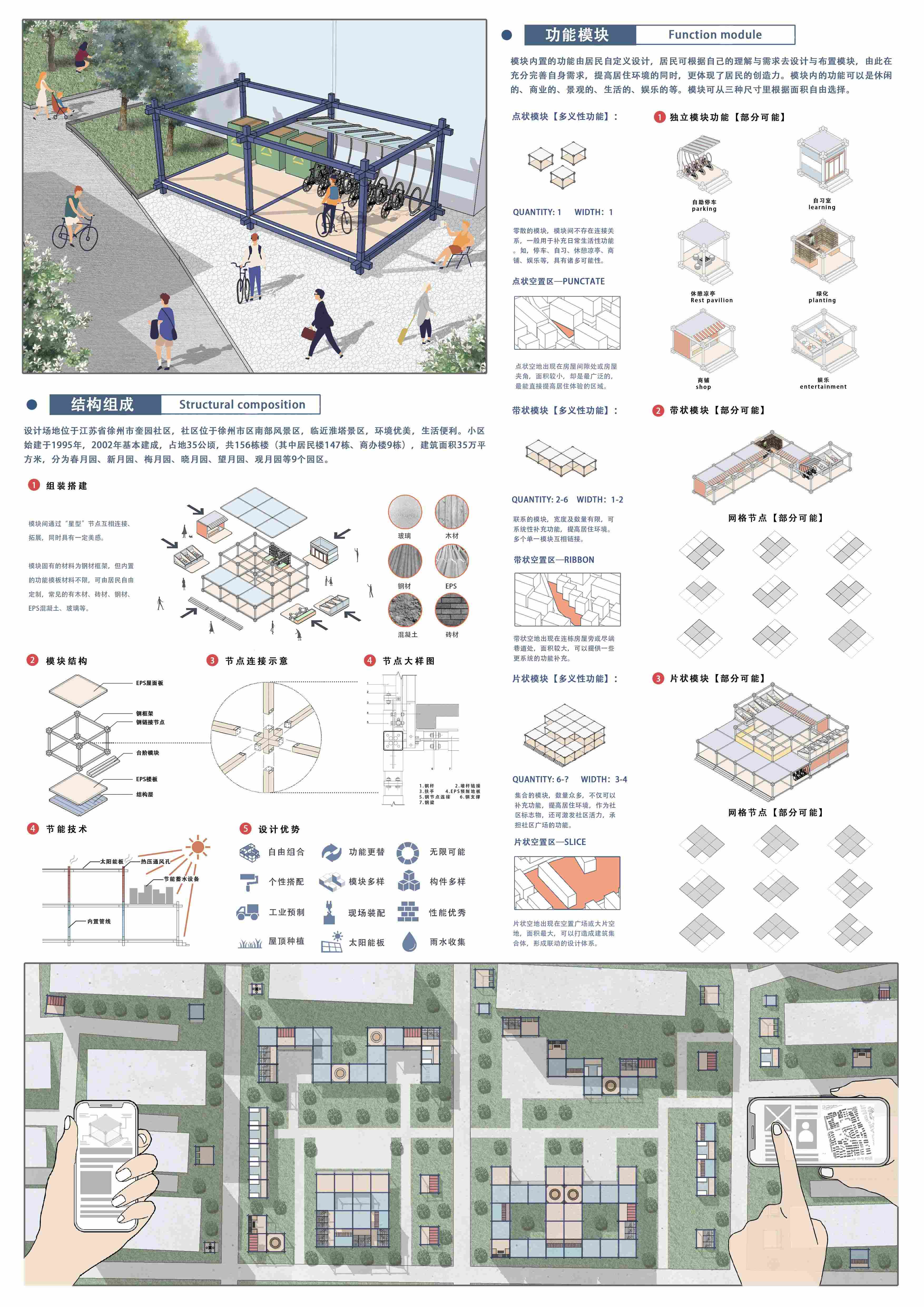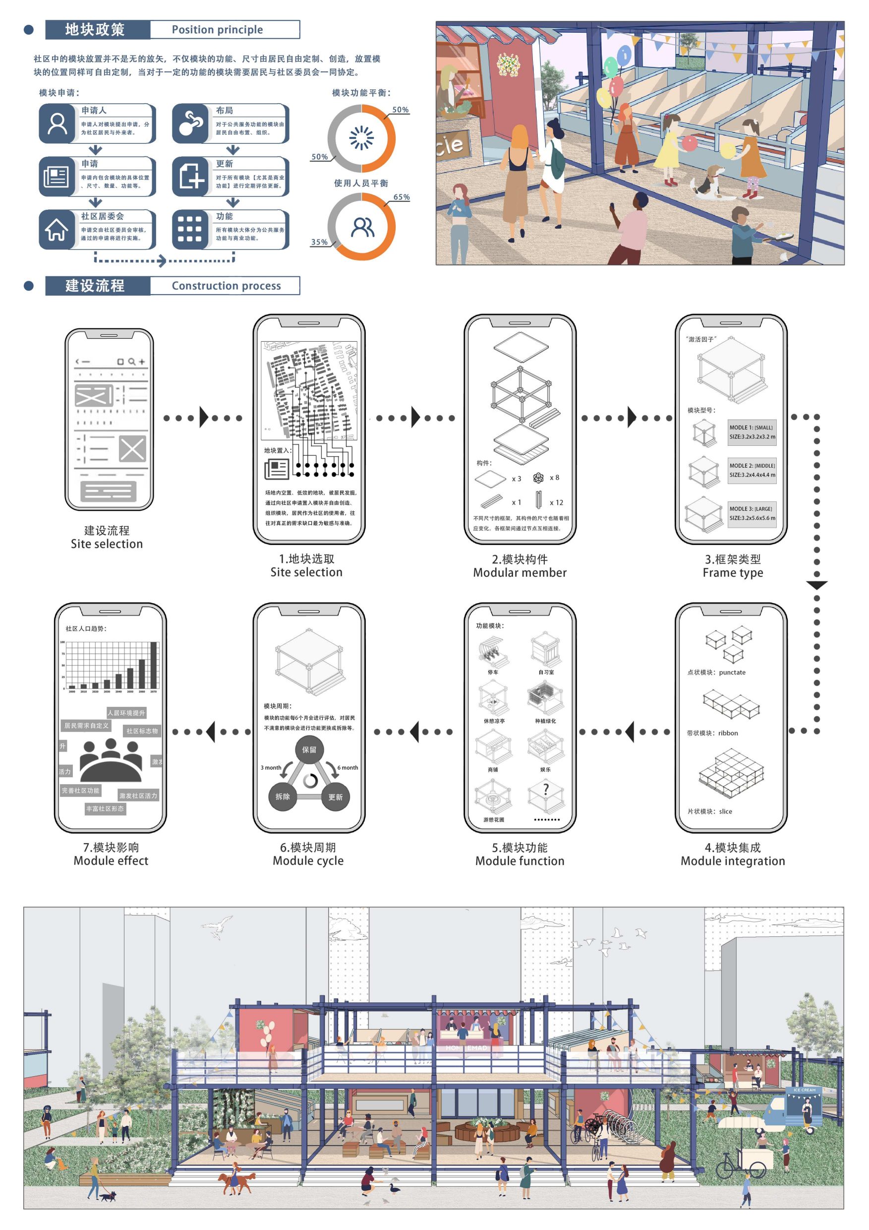 设计采用模块化技术,将“激活因子”理念置入设计,通过设计一系列自由的框架作为“激活因子”所有居民自由选择、组织、布置、完善、使用空间,鼓励居民自发创造、组合,由此产生多义性的理解,在此基础上,居民的主观性被“激活因子”激发,由此产生了一系列动态的、自由的、多义的建筑。